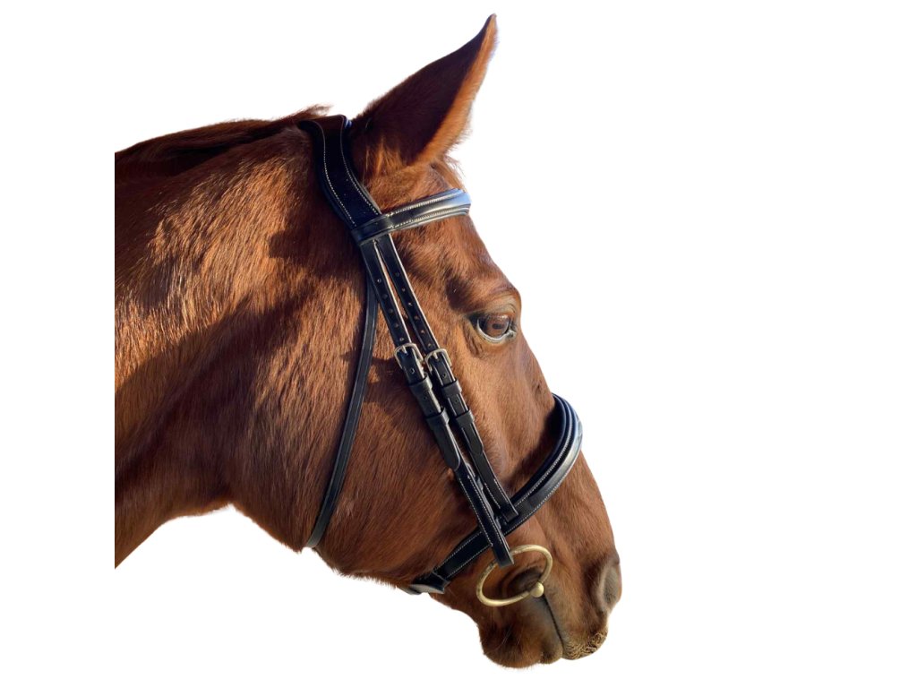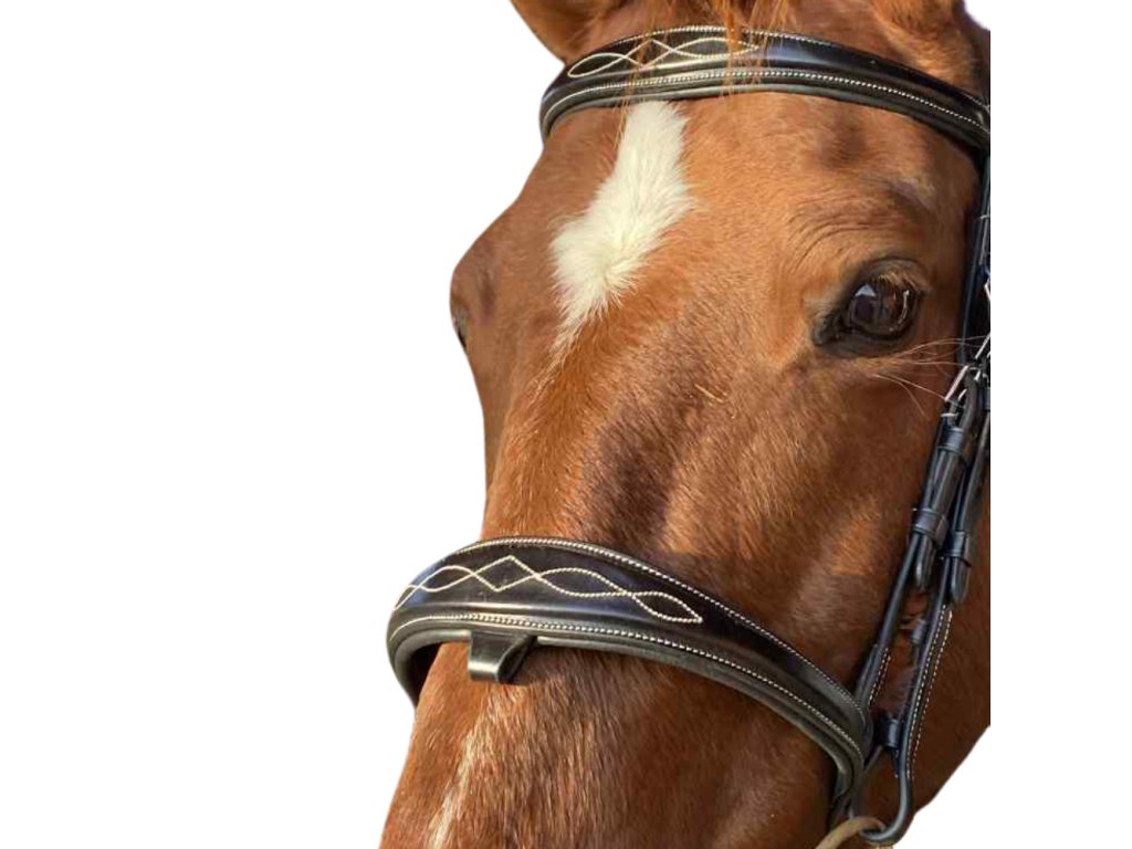 Luxusní uzdečka s rozšířeným anglickým kombinovaným nánosníkem a rozšířenou čelenkou.