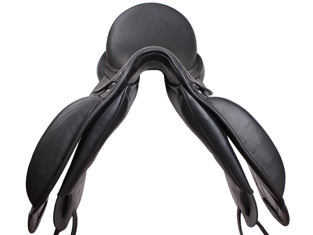 Drezurní sedlo Ithaka s venkovní opěrkou, která výrazněji fixuje nohu jezdce.