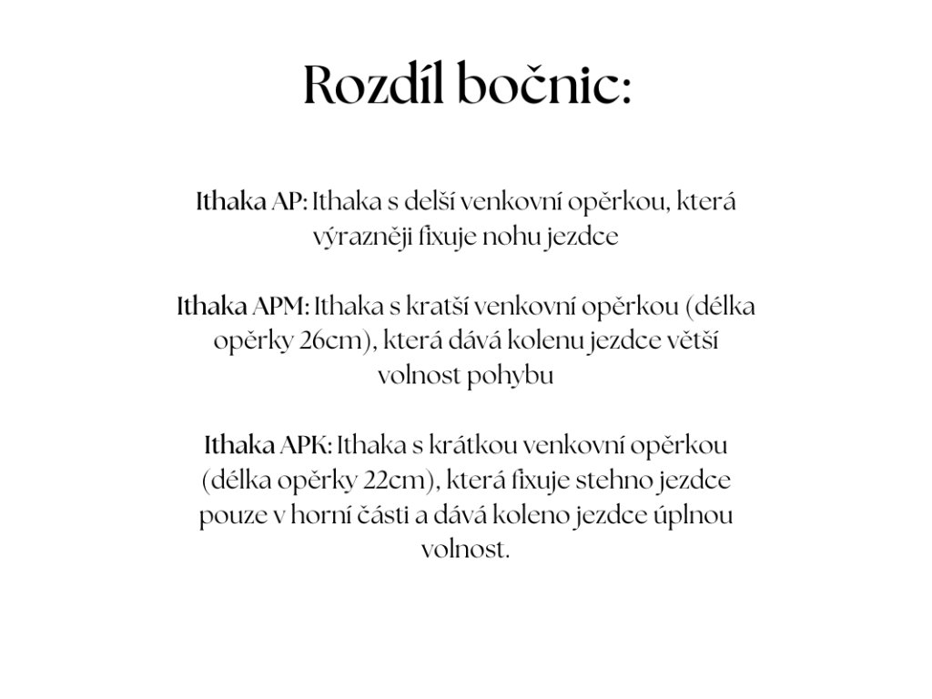 Drezurní sedlo Ithaka s krátkou venkovní opěrkou (délka opěrky 26cm), která dává kolenu jezdce větší volnost pohybu. Sedlo je dodáváno pouze v provedení z dvojité teletiny. Varianta se dvěma bočnicemi i jako monoblat ( na obrázku je jednobočnicová varianta ).