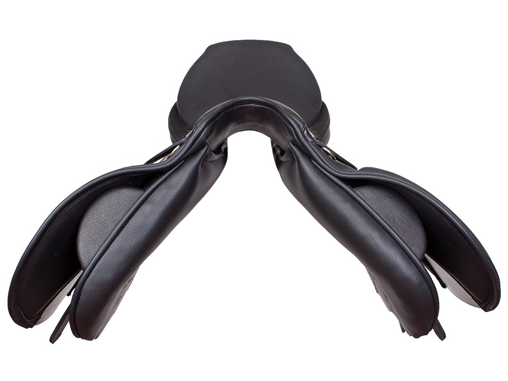 Skokové sedlo na středně hluboké kostře. Optimální velikost bočnice pro starší děti a juniory. Středně vysoké opěrky. Tenký vlněný polštář dobře pasující i na kulaté koně s nevýrazným kohoutkem.