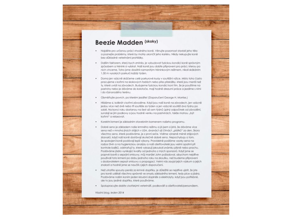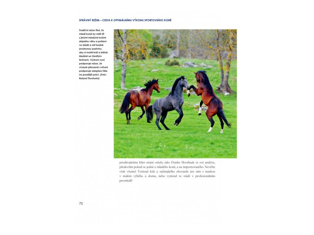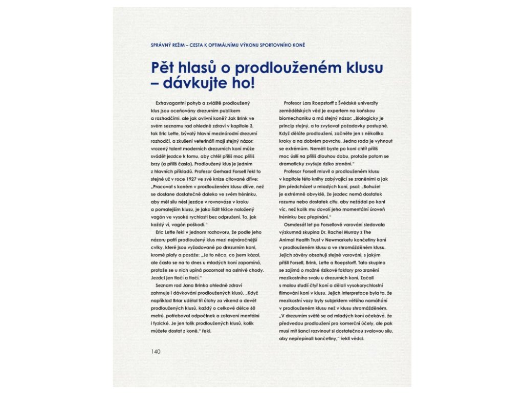 Díky svému veterinárnímu vzdělání, odborným výzkumům a četným rozhovorům se špičkovými jezdci a trenéry z celého světa – včetně Beezie Madden, Carla Hestera a Pippy Funnell, abychom jmenovali aspoň některé z nich – poskytuje autorka rady, jak si vychovat šťastného a zdravého atleta. Tato kniha se speciálně zaměřuje na svědomitě zvolené tempo budování fyzické kondice koně, různorodost tréninku, detailně propracovaný management a péči a zdůrazňuje upřednostnění potřeb koně před závodními ambicemi. Díky tomu čtenářům rozsáhle objasní, co to znamená skutečně dosáhnout na vrchol jezdeckého sportu – a zůstat tam – na pevných základech. Text je provázen krásnými barevnými fotografiemi světově známých koní a lidí, kteří s nimi pracují, díky čemuž kniha i vizuálně demonstruje úspěch těchto metod.
