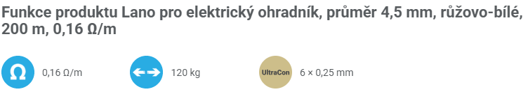 Vodivé lano pro elektrický ohradník s vodičem UltraCon s vysokou vodivostí a pevností. UV ochrana. Díky šesti velmi silným UltraCon vodičům 6 × 0,25 mm je páska velmi pevná a vydrží. Průměr 4,5 mm. Zajištění špičkové vodivosti - velmi nízký odpor 0,16 Ω/m.