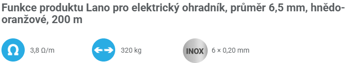 Vodivé lano pro elektrický ohradník s délkou 200 m. Hnědo-oranžové barevné provedení pro lepší viditelnost. Šest pevných nerezových vodičů uvnitř lana. Odpor 3,8 Ω/m.
