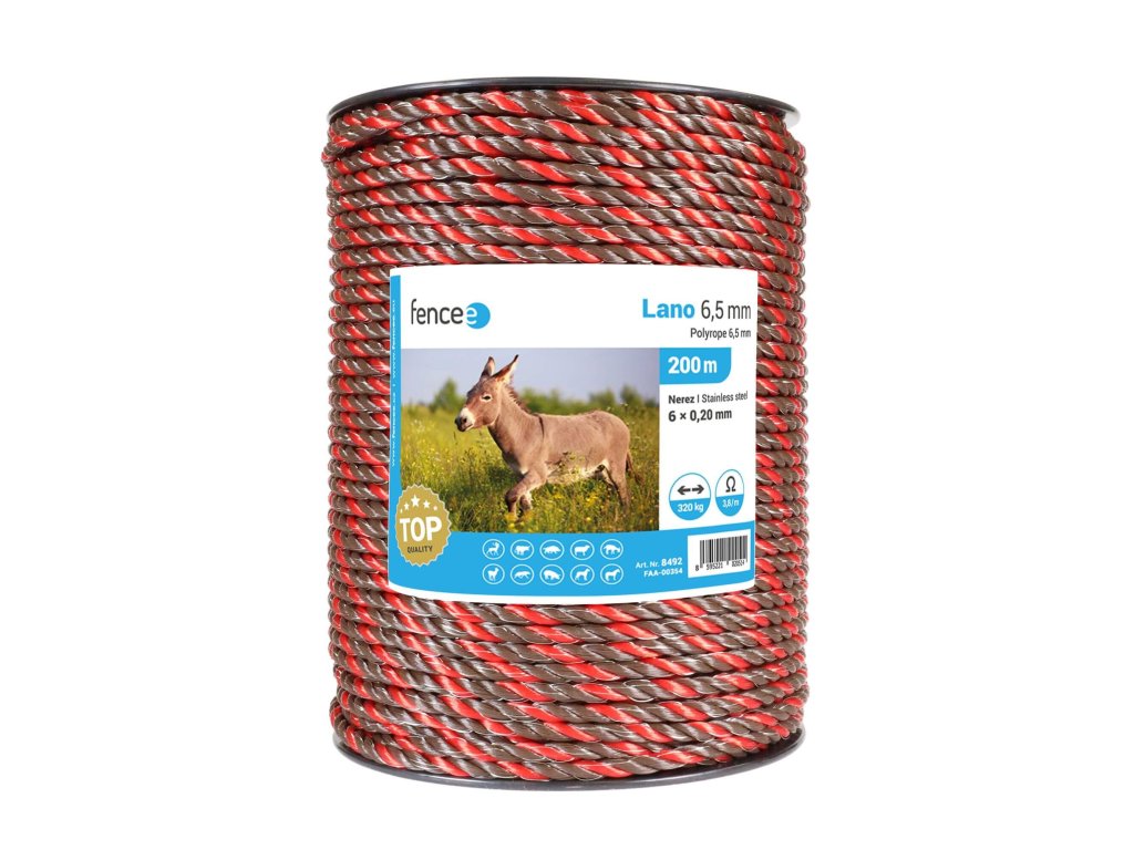 Kvalitní elektrický provaz na ohradník s větším ø 6,5 mm pro vysokou odolnost proti roztržení.