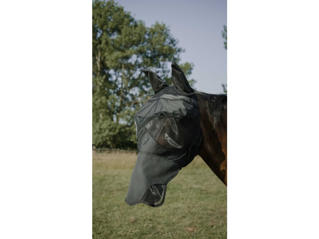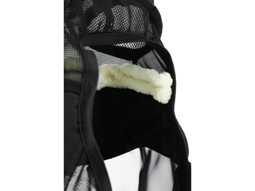 Čelní část masky je podšita syntetickým beránkem, který zvyšuje pohodlí a pomáhá předcházet oděru. Součástí masky je také pevně integrovaná ochrana nozder, která poskytuje dodatečnou ochranu proti hmyzu i slunci. Zapínání pod hrdlem je řešeno pomocí dvou dvojitých pásků na suchý zip, které zajišťují bezpečné a stabilní uchycení.
