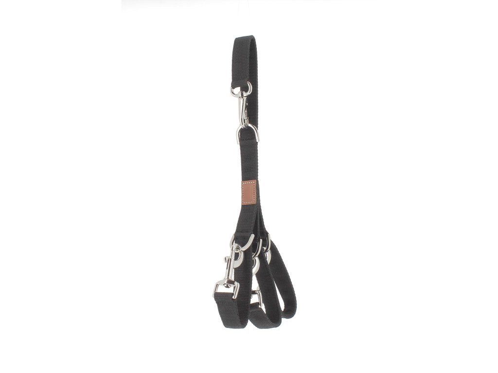 Vyrobeno ze 100% polyesterového popruhu a 100% nerezového kování. K dispozici v černé barvě se stříbrnou karabinou. Univerzální velikost, která se přizpůsobí každé uzdečce.