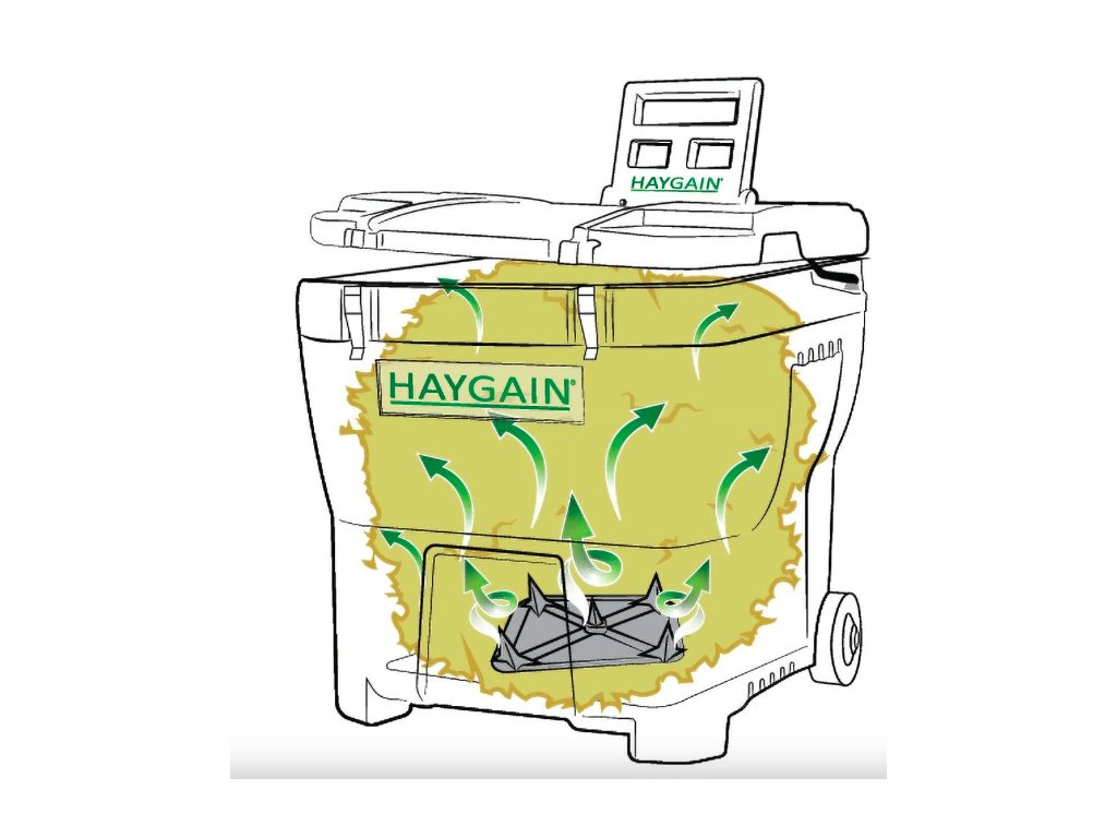 Patentovaný systém rozdělení tysek Haygain vstřikuje vysokoteplotní páru rovnoměrně do celého krmiva v dvojplášťovém, tepelně utěsněném boxe. Proces napařování dosahuje a udržuje teplolu 100 stupňů, což je potřebné na ničení plísní a bakterií.