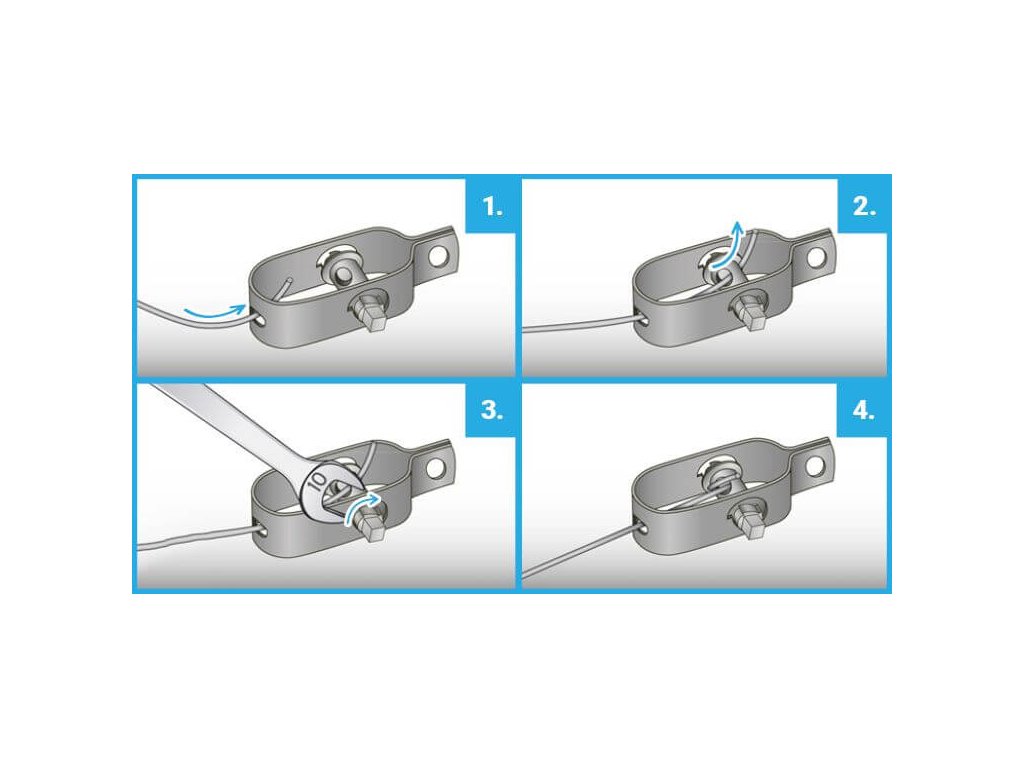 Připevňuje se ke koncovým sloupkům pomocí očka. Poté se vodič napne klíčem (vel. 10).