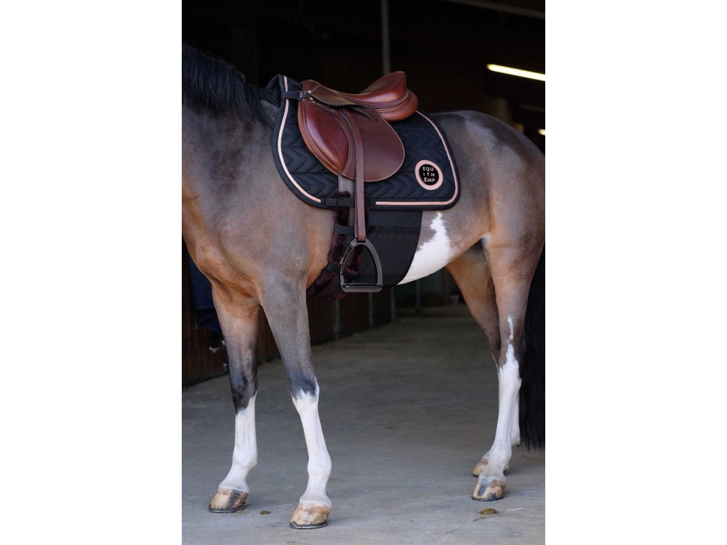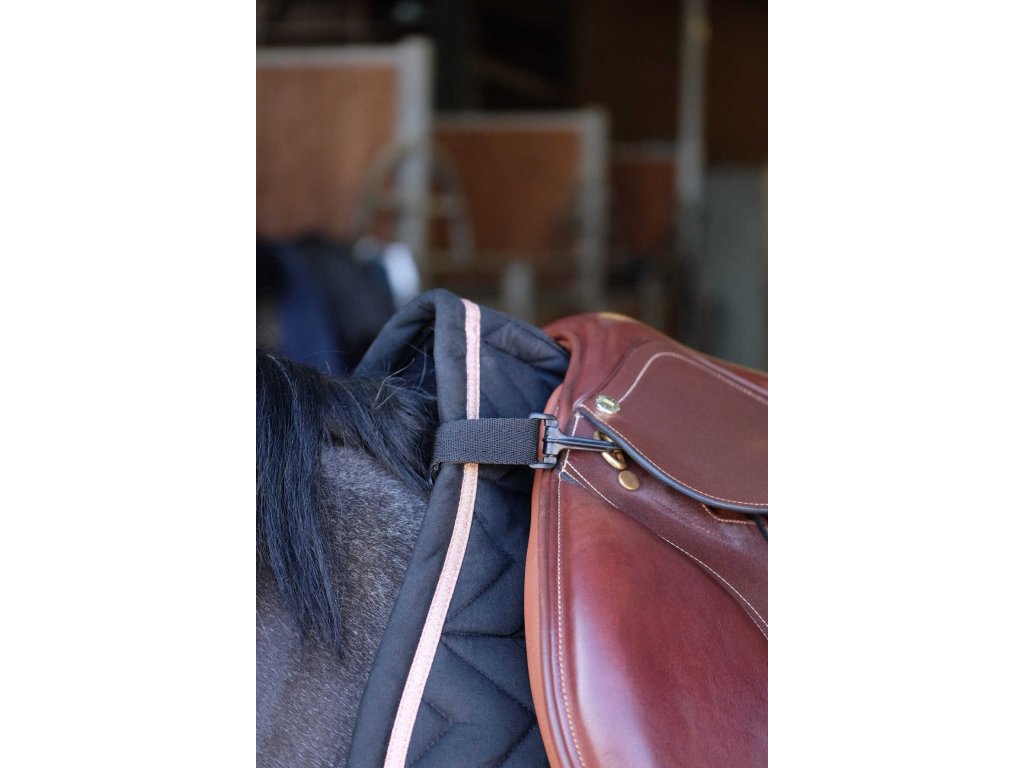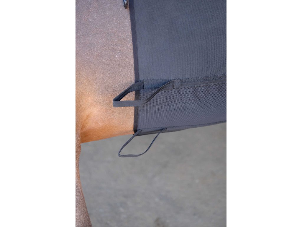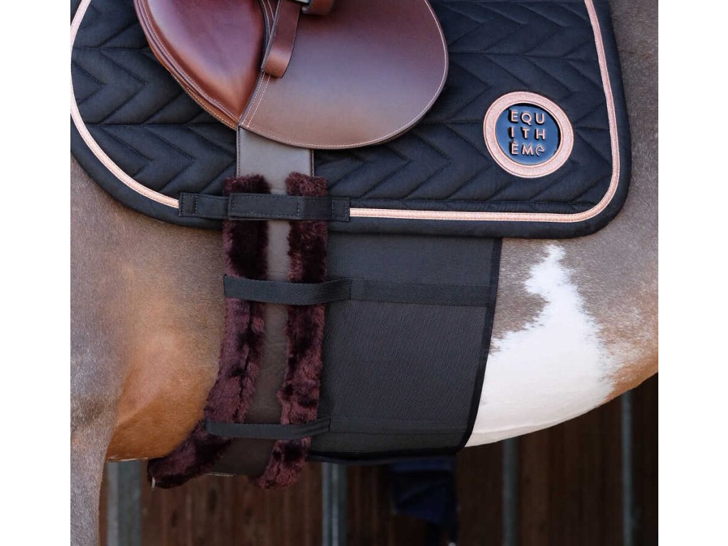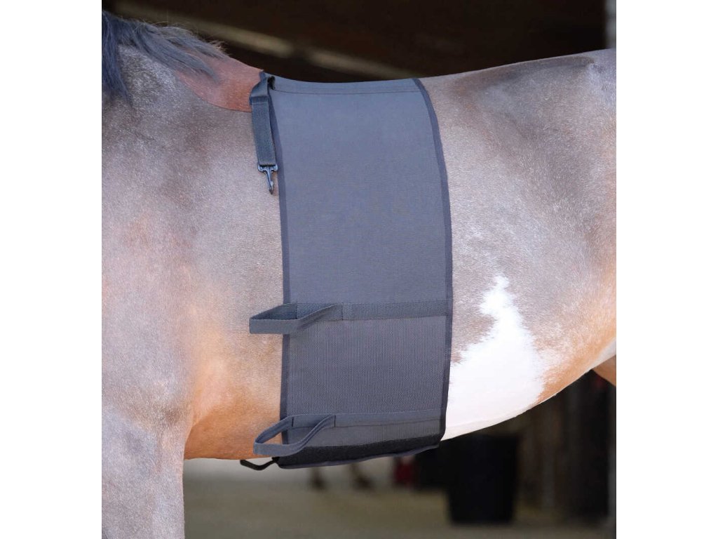 Flexibilní, pohodlná a prodyšná ochrana, která zabraňuje podráždění či poranění koně při používání ostruh. Snadné upevnění pomocí suchého zipu umožňuje rychlé nasazení na jakýkoli typ podbřišníku.