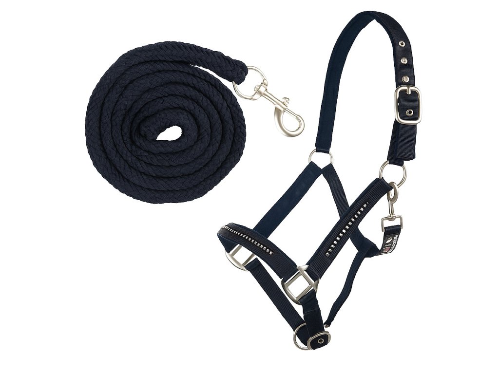 Ohlávka s vodítkem od HKM zdobená kamínky. Nastavitelná na nátylníku a nánosníku. Délka vodítka 1,8 metru.