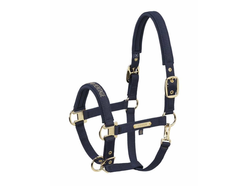 Dvojité trnové přezky na obou stranách umožňují přesné nastavení, stejně jako nastavitelná lícnice pod bradou. Ohlávku doplňují zlaté kovové komponenty, elegantní Heritage nápis na nánosníku a kovová Eskadron destička na levé straně, které podtrhují její prémiový vzhled.