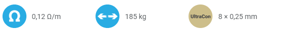 Toto vodičové lanko obsahuje UltraCon super vodivý vodič s 8 × 0,25 mm vodivými drátky, které zajišťují špičkovou vodivost a nízký odpor pouhých 0,12 Ω/m. Tento parametr je klíčový pro udržení stálého elektrického impulzu na dlouhé vzdálenosti, což zaručuje spolehlivý výkon vašeho elektrického ohradníku.