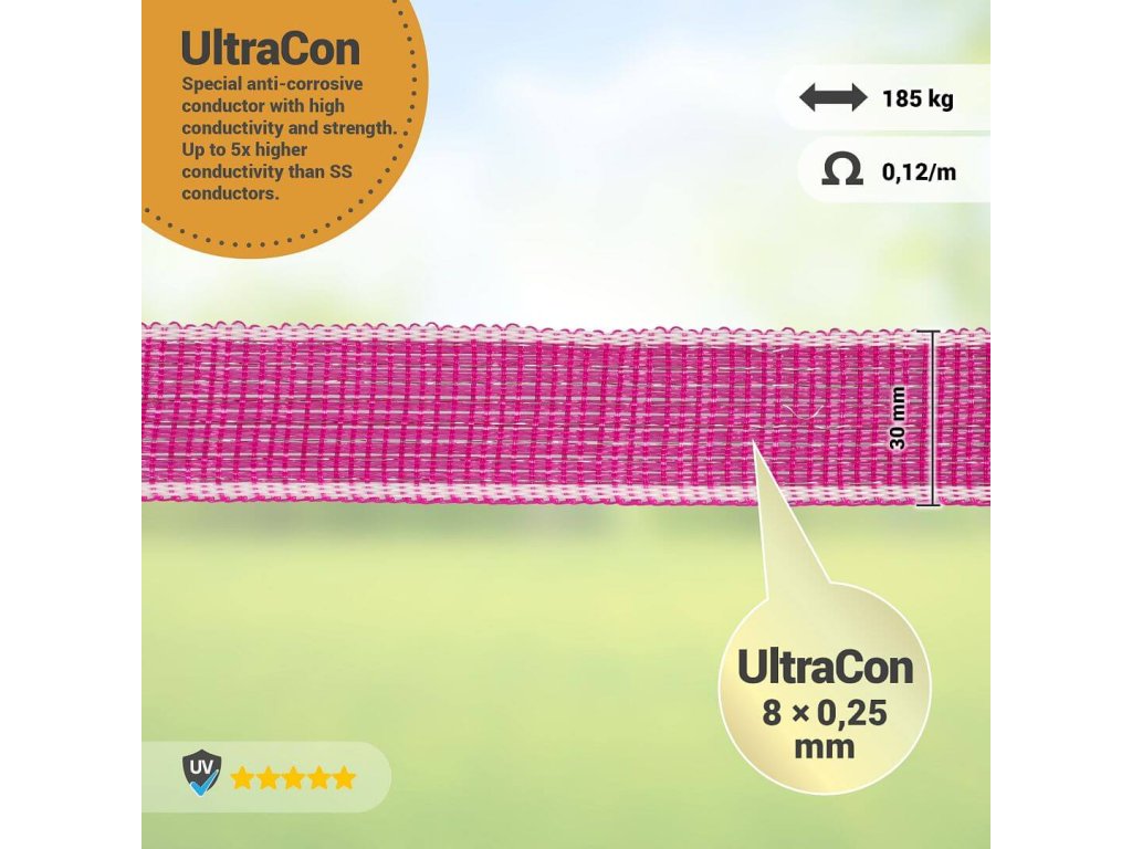Unikátní vodivá páska pro elektrický ohradník s netradiční šířkou 30 mm a aktraktivním barevným provedením. Elektrická páska s vodičem UltraCon s vysokou vodivostí a pevností. Díky velmi silným UltraCon vodičům 8 × 0,25 mm je páska velmi robustní a odolná. Zajištění špičkové vodivosti - velmi nízký odpor 0,12 Ω/m.