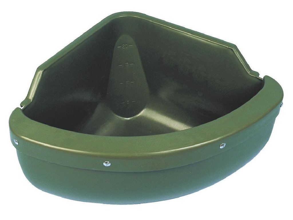 Plastový rohový žlab s hranou včetně ochranné hrany proti vyhazování krmiva a okusování.
