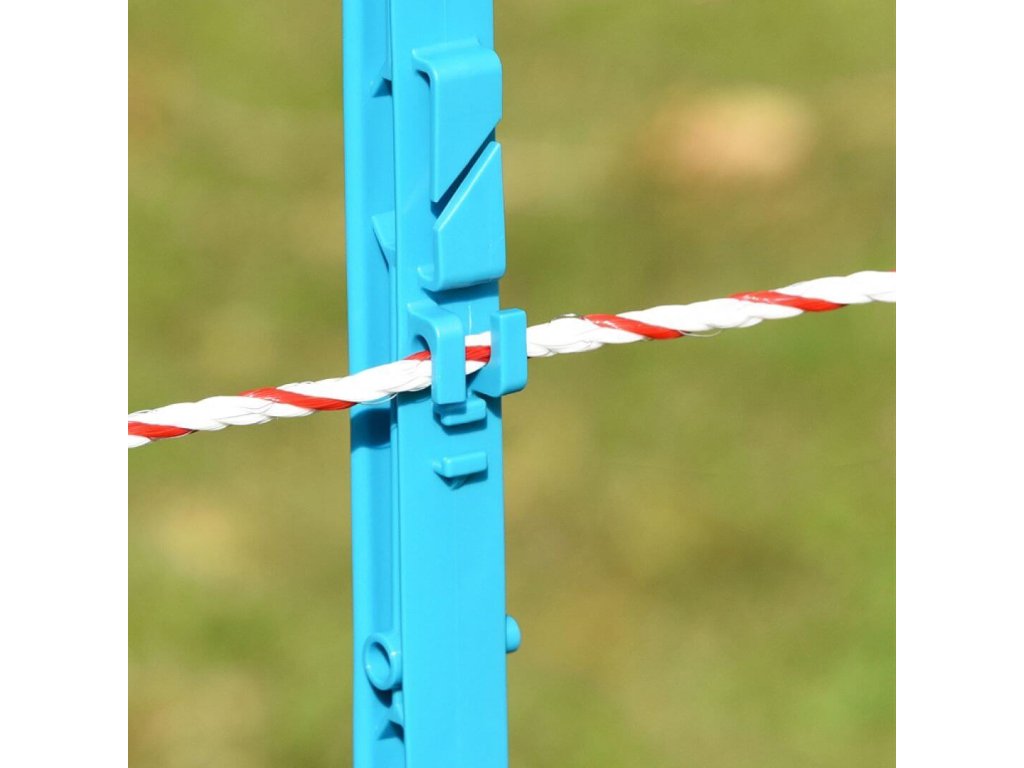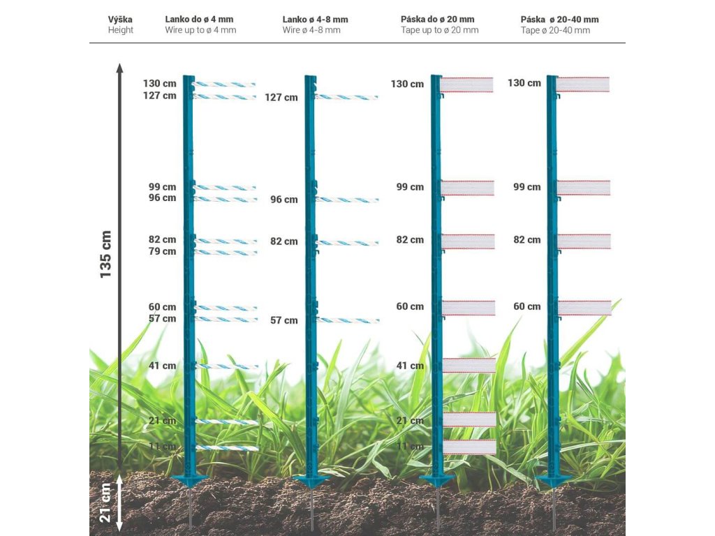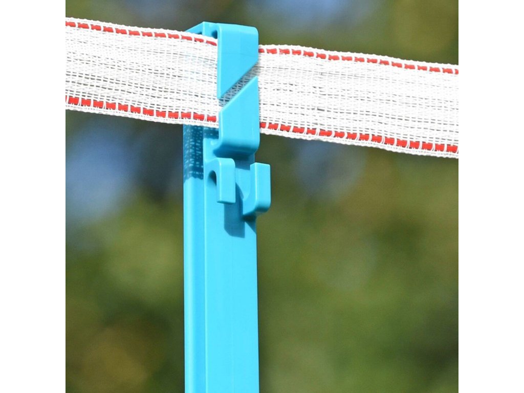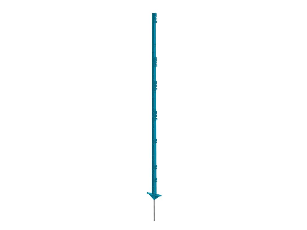 Mobilní plastový sloupek s dvojitým nášlapem pro elektrický ohradník v modré barvě s 11 očky pro běžné vodiče ohradníku. Vysoce kvalitní materiál s vyztužením ze skelných vláken a vysokou UV stabilitou je odolný proti ohýbání a zlomení. Robustní kovová špice. Celková výška sloupku 156 cm, výška nad zemí 135 cm.