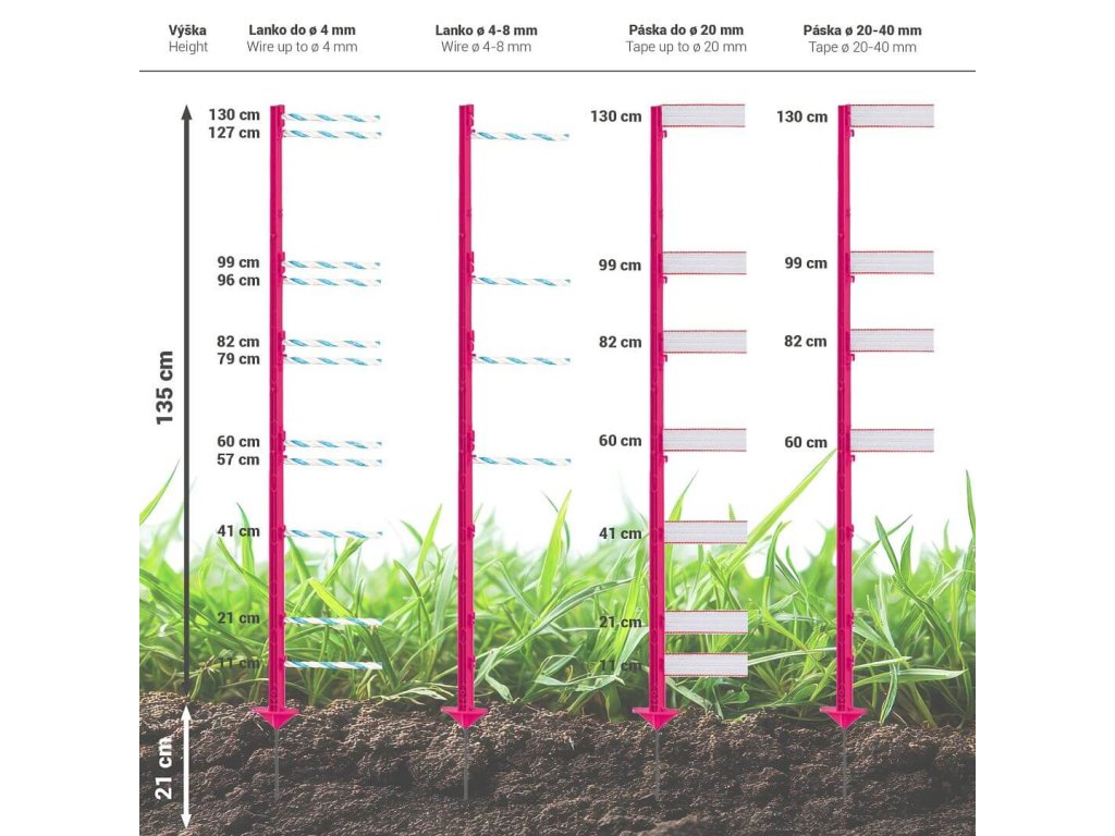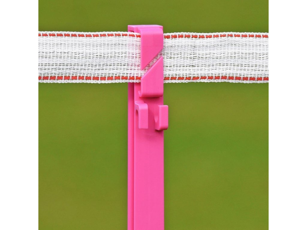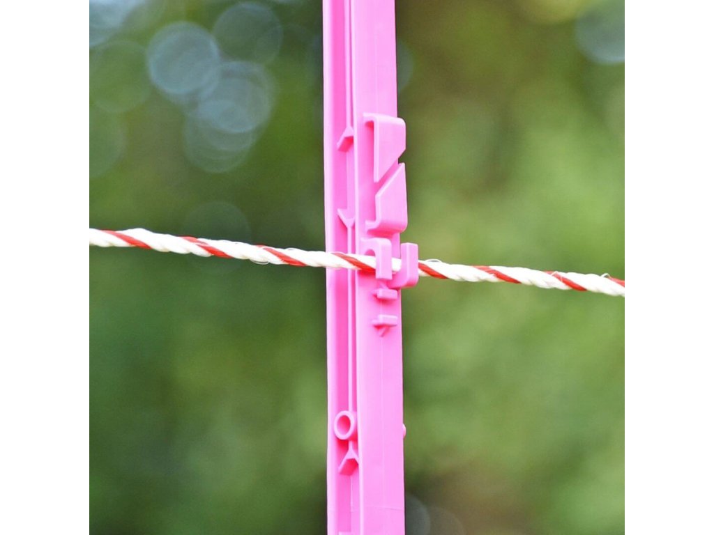 Vysoký růžový plastový sloupek pro elektrický ohradník. Celkem 11 oček pro vodiče ohradníku. Kvalitní materiál s vyztužením ze skelných vláken a vysokou UV stabilitou. Odolnost proti ohýbání a zlomení. Délka sloupku 156 cm, výška nad zemí 135 cm.