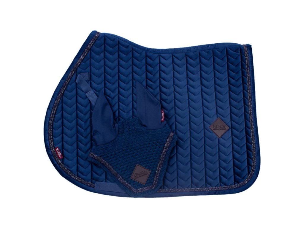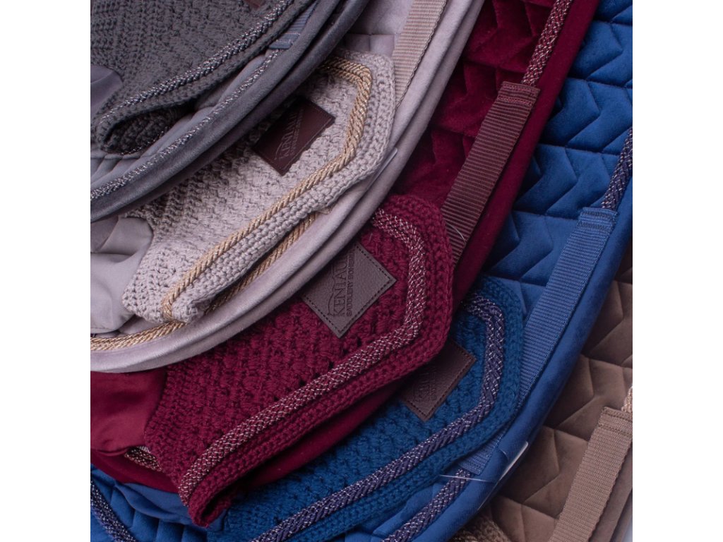 Sametová podsedlová dečka s novým vzorem prošívání v sadě s náušníky. Ozdobné kroucené šňůry s