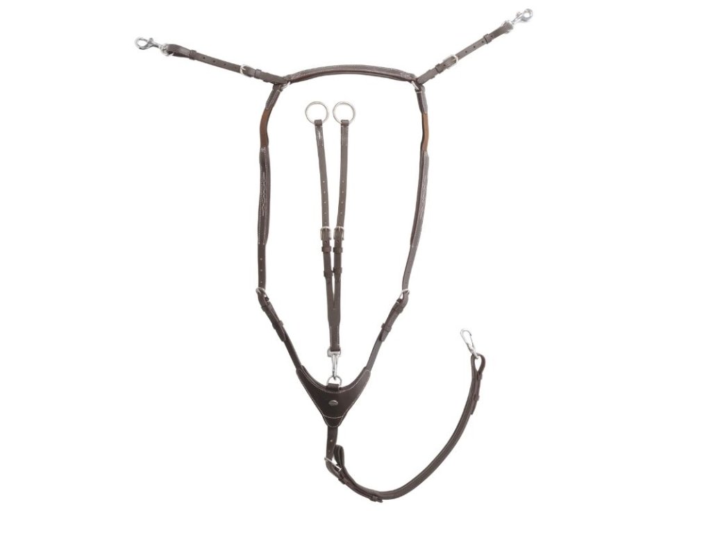 Pevný s předním nastavením zajišťuje bezpečné držení a individuální přizpůsobení. Součástí je odnímatelná martingalová vidlice, kterou lze dle potřeby snadno připnout nebo odepnout, což zvyšuje univerzálnost použití.