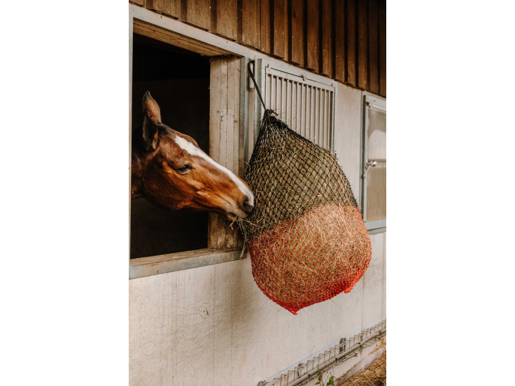 Síť na seno pro koně - slouží ke kontrole množství podávaného sena a podporuje jeho pomalejší a přirozenější příjem. Jemná a zároveň velmi odolná šňůra zajišťuje dlouhou životnost i při každodenním používání. Malá oka umožňují regulované uvolňování sena, díky čemuž kůň přijímá krmivo postupně a bez hltání. Tím se výrazně snižují ztráty sena a zajišťuje se přesnější a efektivnější krmení.