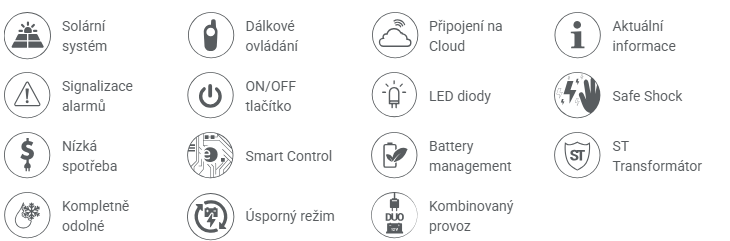 Chytrý solární RF generátor s výkonem 0,8 J se solárním dobíjením ohradníku. Sada s praktickým dálkovým ovladačem, kterým pohodlně zapnete/vypnete napájení elektrické ohrady. Ovladač má podsvícený displej se všemi důležitými informacemi, zvukový alarm a přijímá chybová hlášení, např. při poklesu napětí v ohradě. Lze nabít i provozovat ze sítě přiloženým adaptérem. Efektivní využívání baterie a úsporný režim Power-Save.