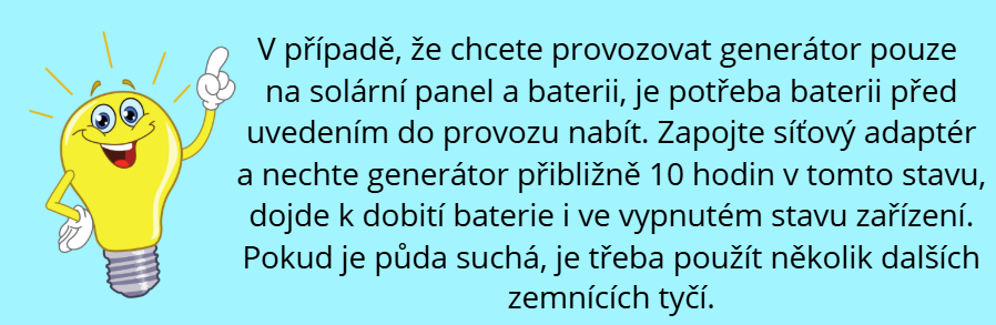 Zařízení je navrženo pro venkovní použití, je odolné vůči dešti a UV záření. Krytí IP44. Vstupní konektor pro připojení síťového adaptéru je vodotěsný. Generátor disponuje integrovanou ochranou před bleskem.