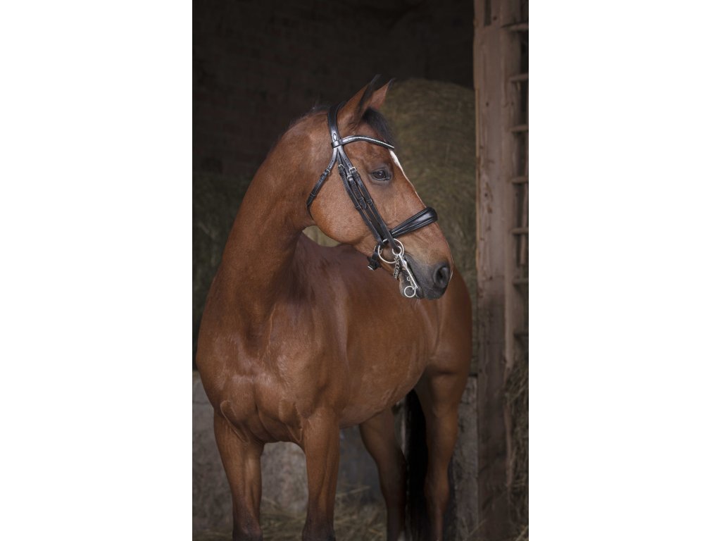 Elegantní černá uzda od Norton. Anatomický vypodložený nátylník i nánosník. Na čelence drobné kamínky. Otěže nejsou součástí uzdečky.