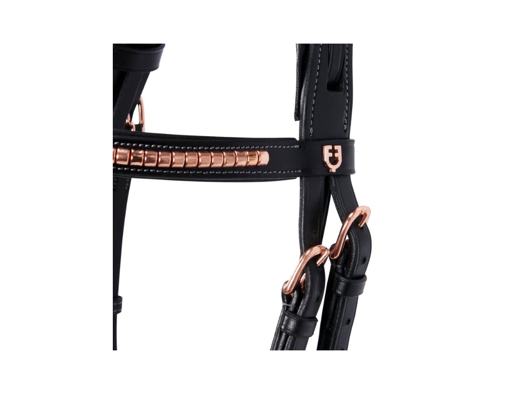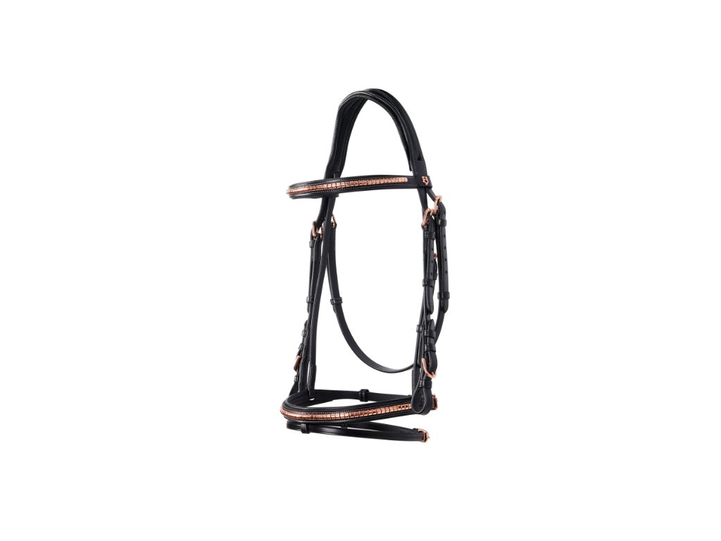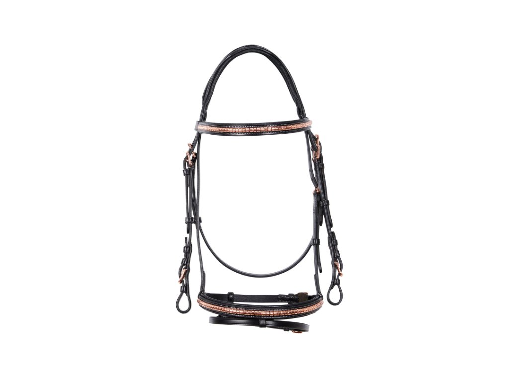 Uzdečka od Equestro s kombinovaným nánosníkem s podpínkou. Zdobená čelenka i nánosník. Anatomicky tvarovaný nánosník. Otěže nejsou součástí balení. Přesky v rosegold barvě.