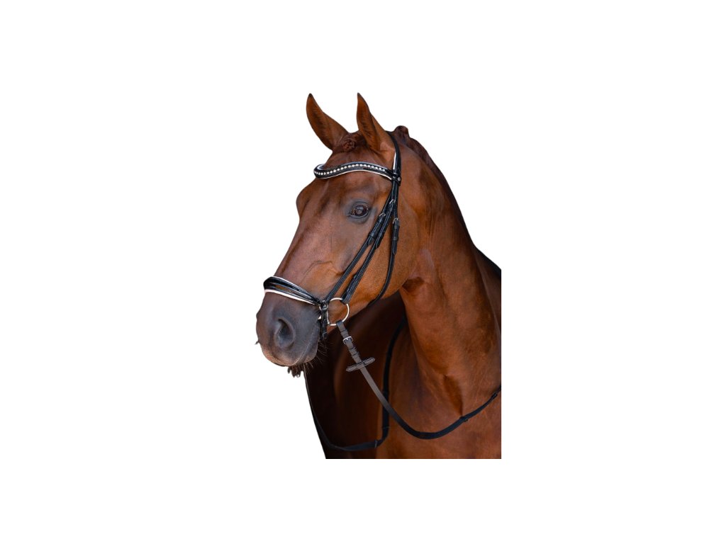 Uzdečka od HKM s hannoverským nánosníkem. Kamínková čelenka a lakovaný nánosník podložený bílou barvou.