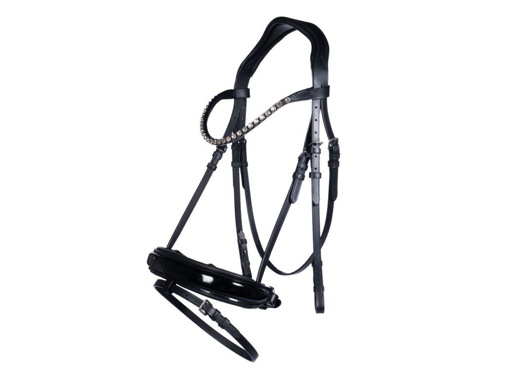 Krásná uzdečka od HKM z kvalitní kůže s kamínkovou čelenkou. Širkový lesklý švédský nánosník s podpínkou. Nánosník i nátylník měkkce vypodložen. Stříbrné přezky. Uzdečka dodávána bez otěží.