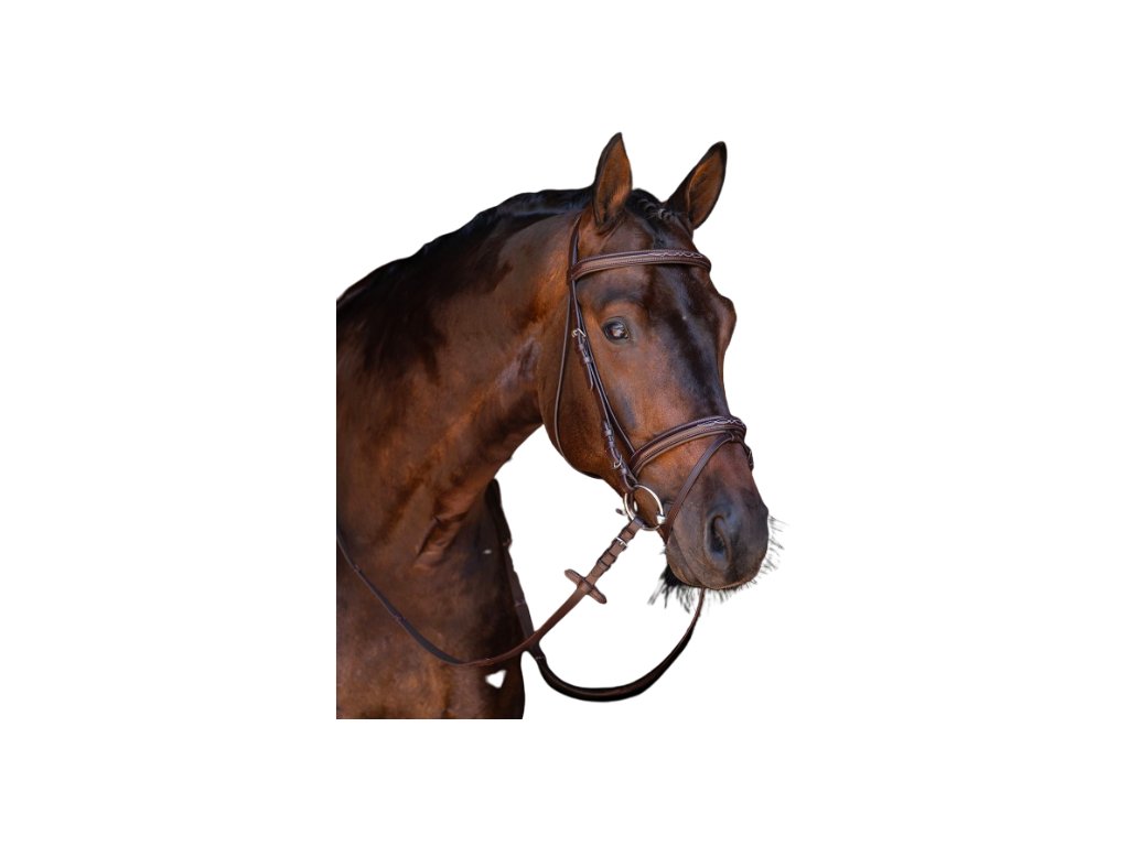 Uzdečka od HKM s kombinovaným anglickým nánosníkem v hnědé barvě s elegantním bílým prošitím.