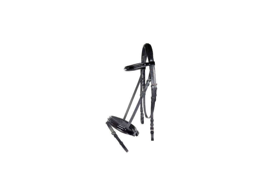 Uzdečka od HKM s lesklou čelenkou i nánosníkem. Nánosník klasický anglický kombinovaný. Čelenka a nánosník zdobená bílým prošitím. Otěže NEJSOU součástí uzdečky.