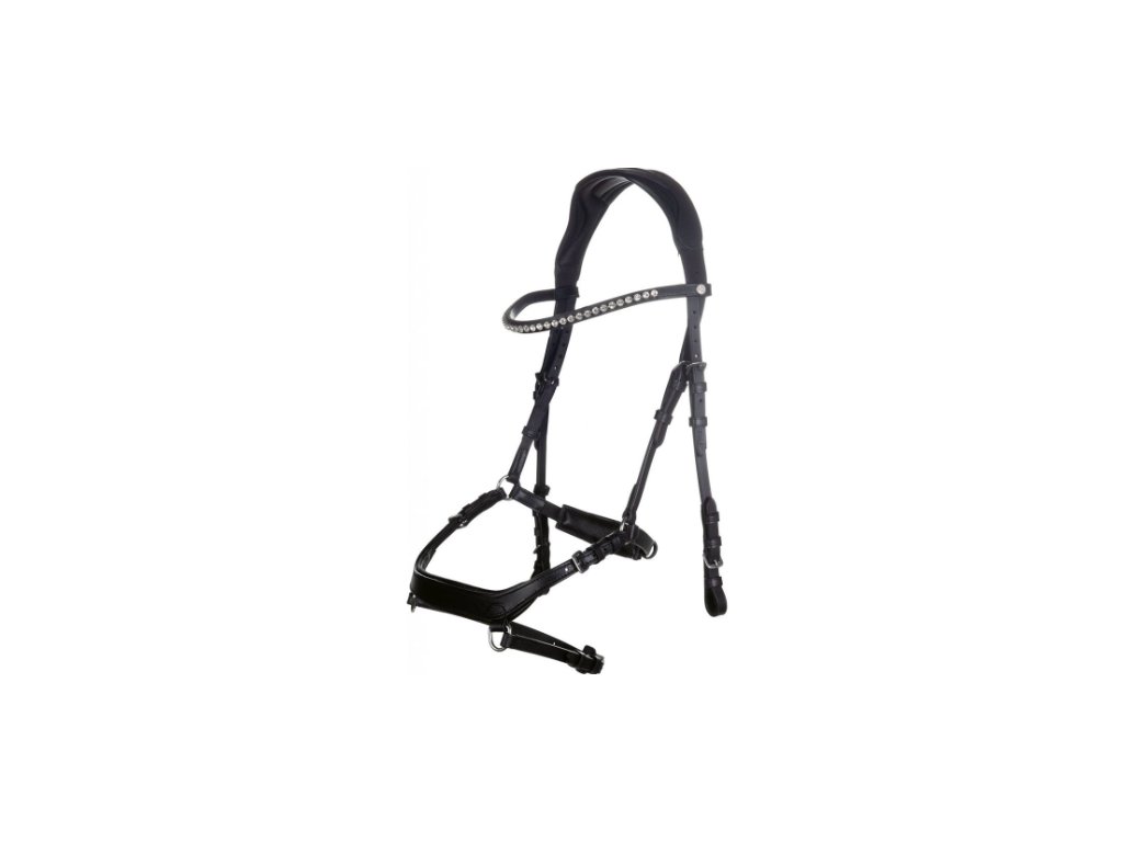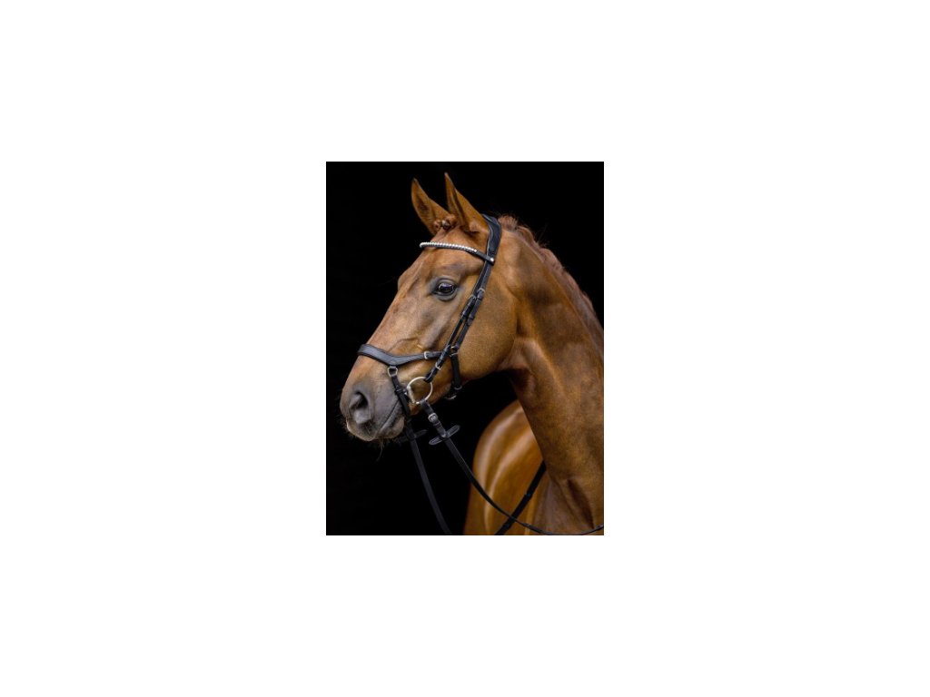 Anatomicky tvarovaná uzdečka od HKM, která zabraňuje tlaku na citlivé oblasti hlavy koně. Uzdečka je velmi kvalitně zpracovaná z kvalitní kůže. Čelenka s kamínky, velmi měkkce vypodložený nánosník i nátylník. Součástí jsou plátěné otěže se zarážkami.