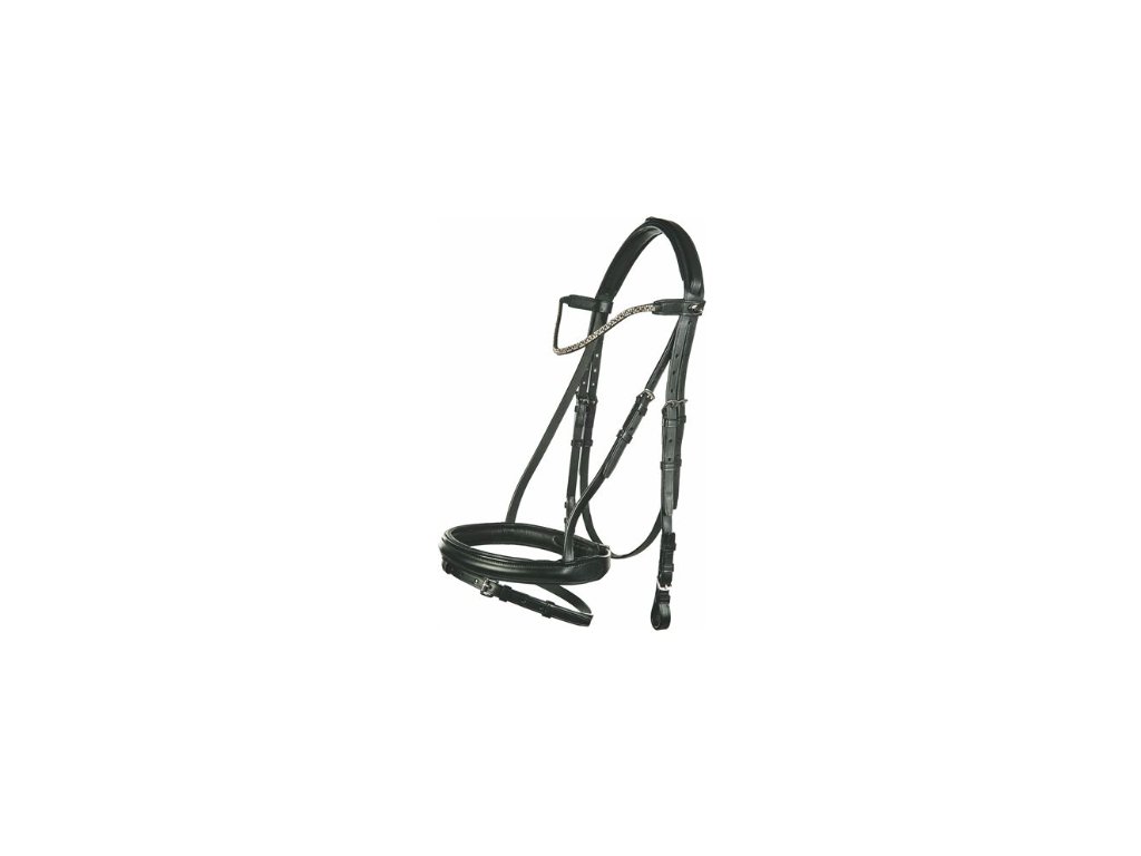 Uzdečka od HKM s kombinovaným nánosníkem a kamínkovou čelenkou. Plátěné otěže se zarážkami jsou součástí uzdečky.