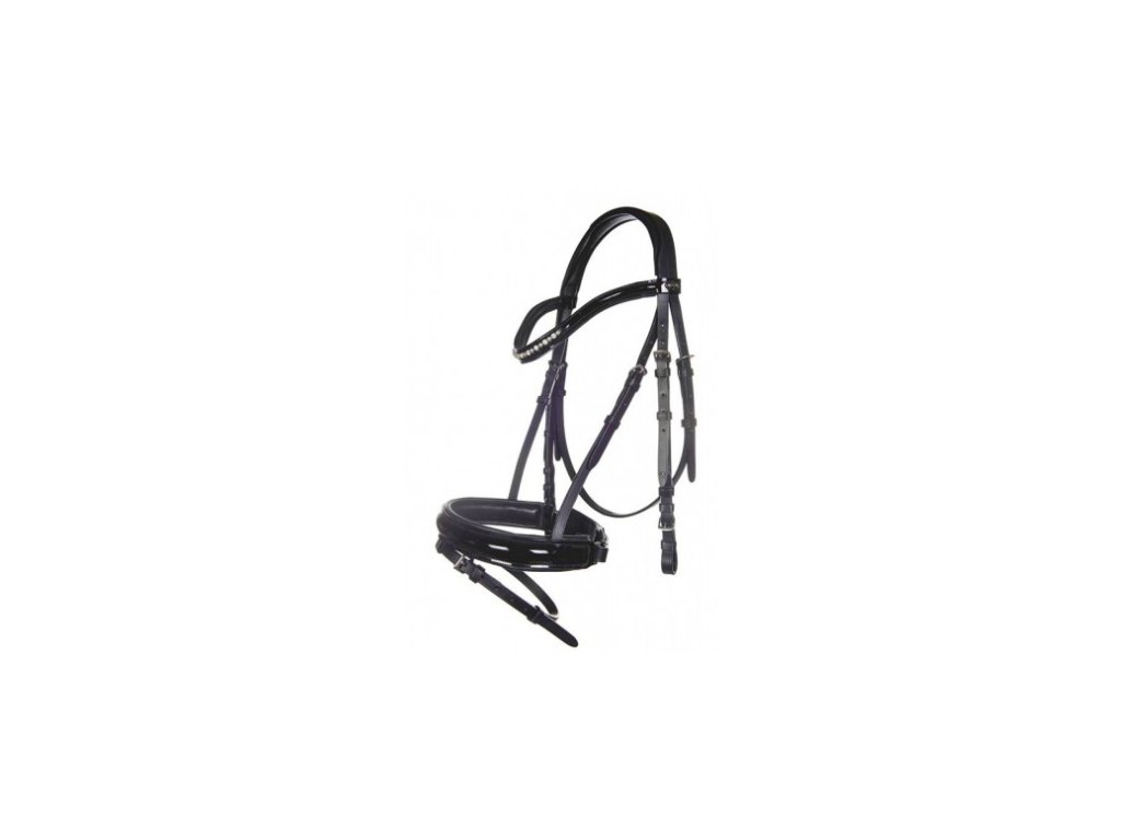 Anglická uzdečka od HKM s kamínkovou čelenkou. Nátylník i nánosník měkkce vypodložen. Kombinovaný nánosník s odjímatelnou podpínkou. Otěže jsou součástí uzdečky.