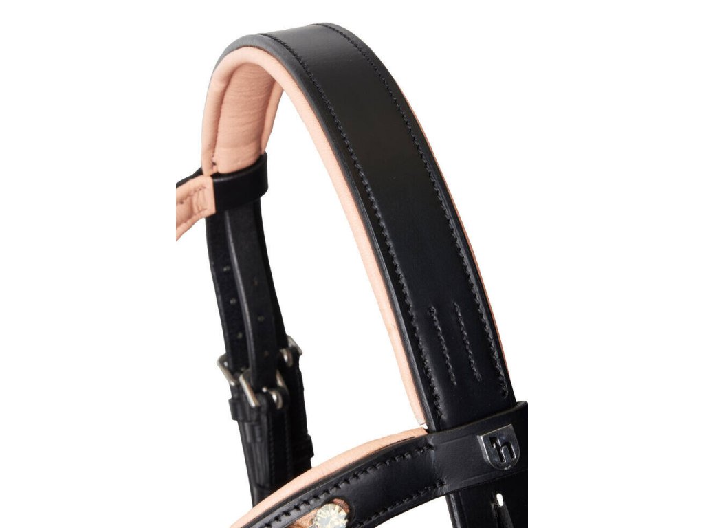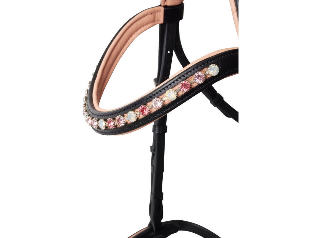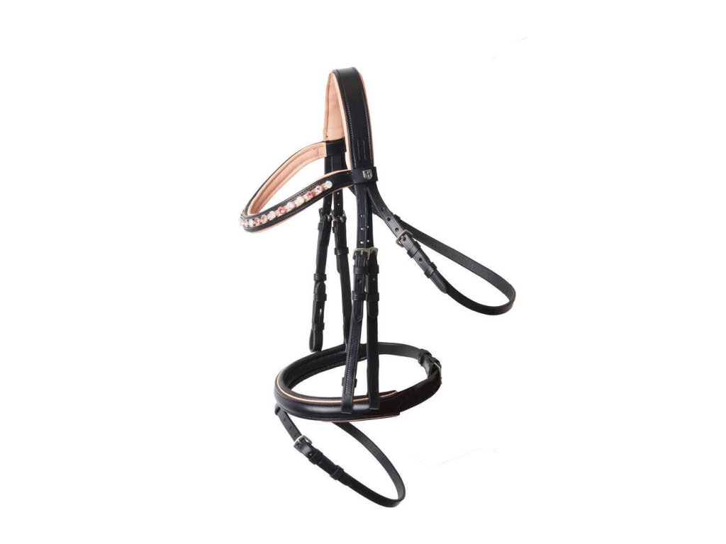 Krásná uzdečka pro pony. Měkce vypodložený nátylník a nánosník zajití komfort pro koně. Kontrastní podložení a kamínky na čelence.