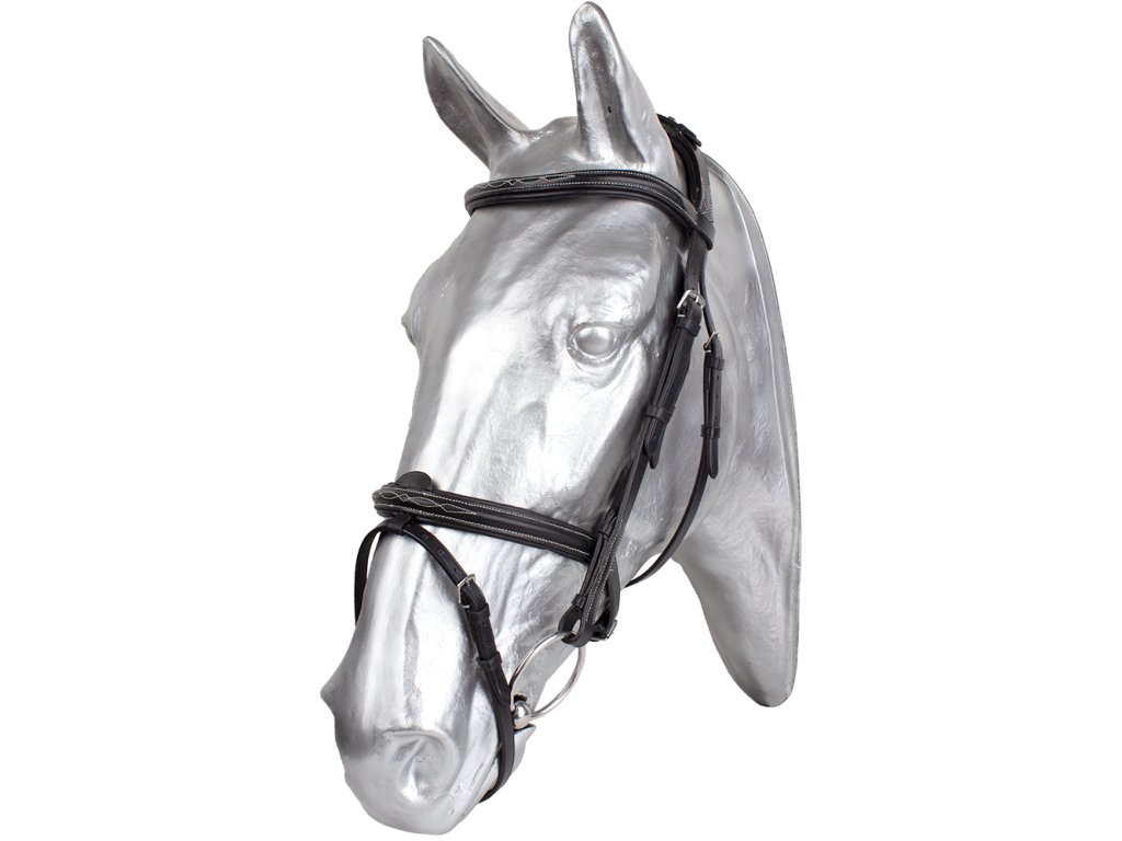 Uzdečka vyrobená z kvalitní kůže s měkce podloženým anglickým kombinovaným nánosníkem a bílým kontrastním prošitím. Poutko na podpínací řemínek je odnímatelné. Dělený, měkce polstrovaný nátylník, který nevytváří tlak na zátylek. Dodáváno včetně plátěných otěží se zarážkami.