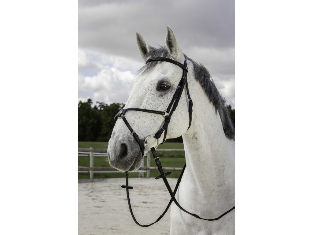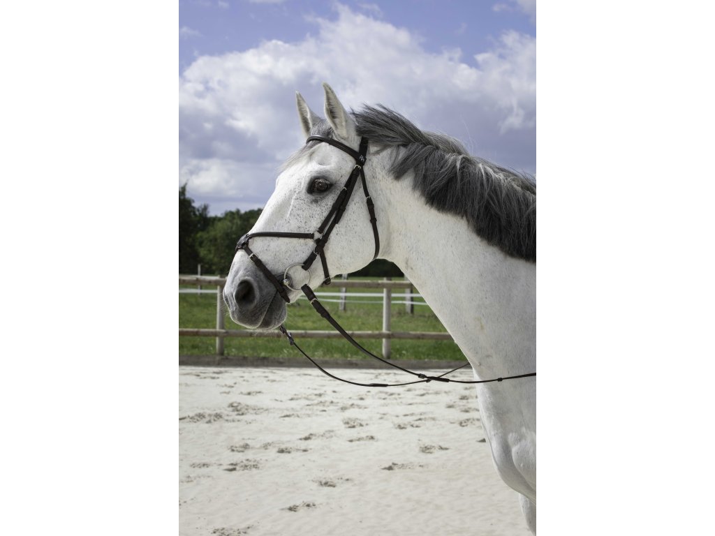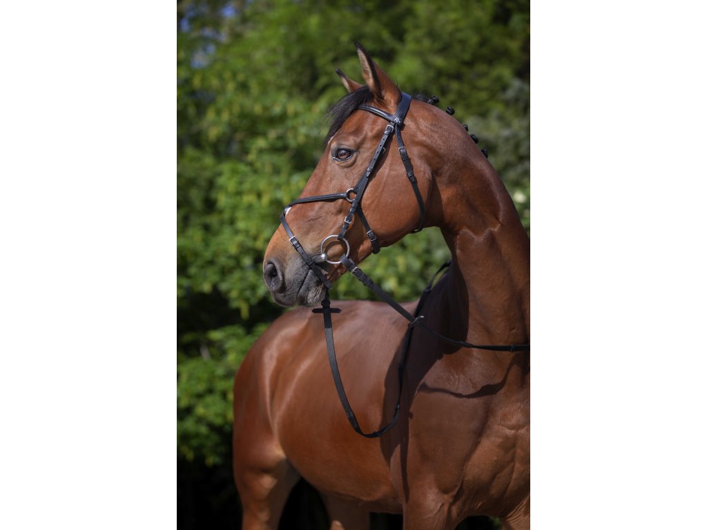 Elegantní uzdečka z probarvované buvolí kůže spojuje styl a maximální pohodlí pro koně. Křížový nánosník s kulatou čelenkou a zdvojeným křížovým nánosníkem zajišťují komfort i stabilitu. Uzdečka je dodávána s otěžemi s pěti koženými dorazy.
