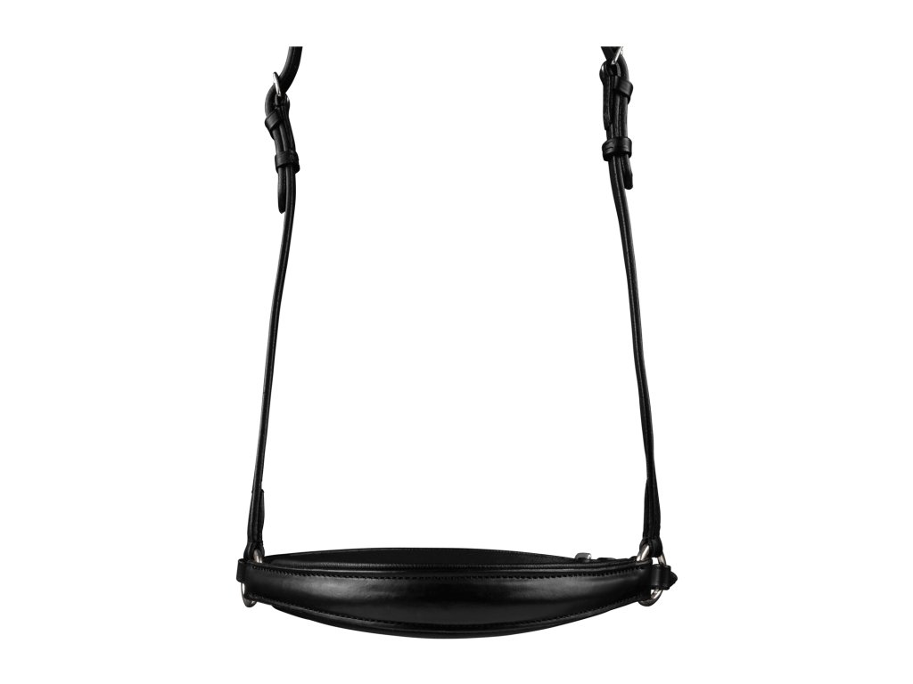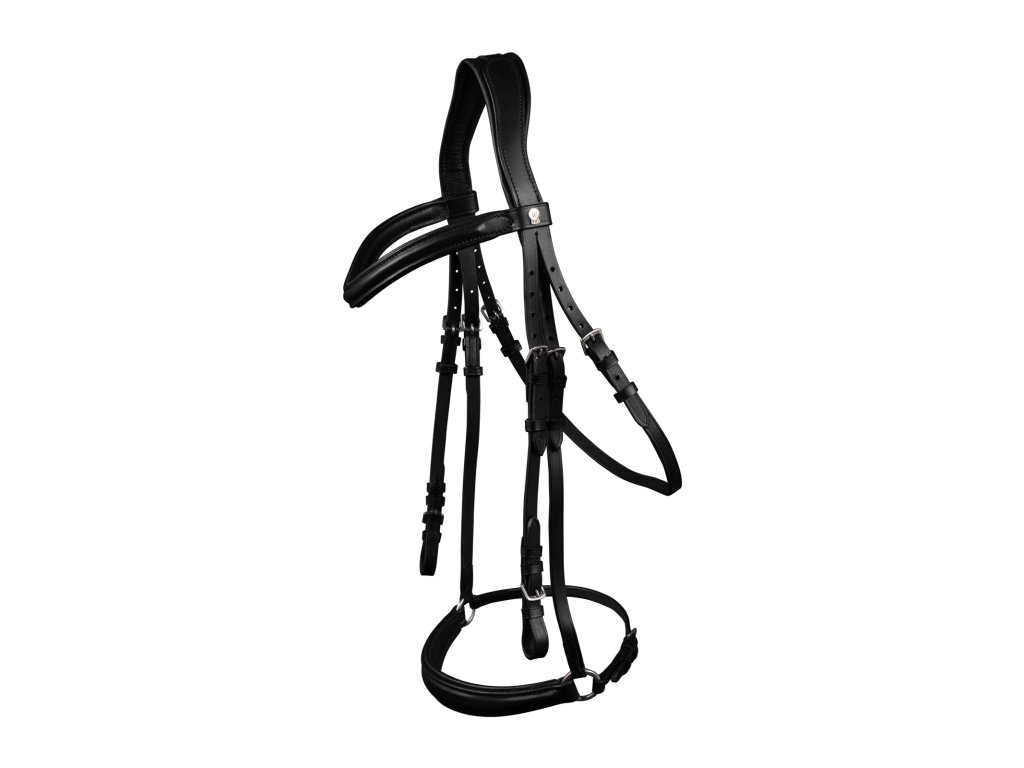 Uzdečka s hannoverským nánosníkem, anatomicky tvarovaným nátylníkem a elegantně prohnutou čelenkou poskytuje koni maximální pohodlí díky měkkému podšití nánosníku, čelenky i nátylníku. Je osazena nerezovým kováním a součástí jsou tkané otěže o šířce 19 mm.