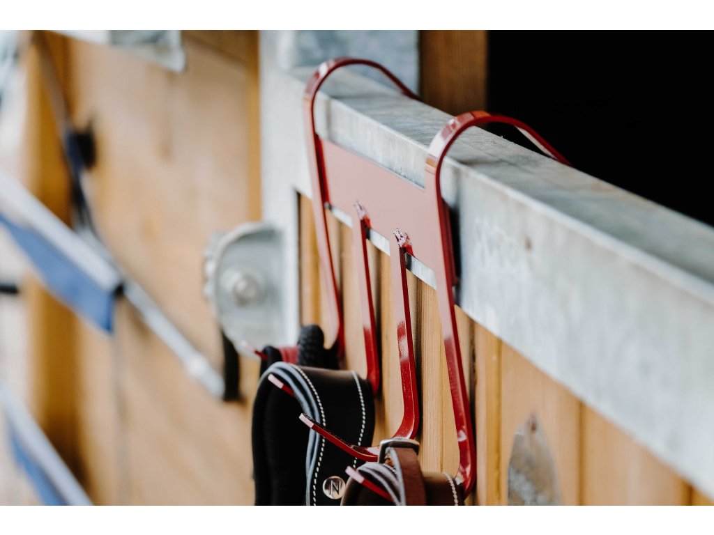 Díky dvěma háčkům se snadno připevní na dveře nebo jiný okraj – rychle, bez nářadí a v jediném pohybu. Je přenosný a všestranný, takže ho můžete využít ve stáji, na závodech i doma.