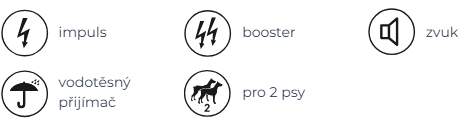 - zobrazení displeje: úroveň stimul. impulsu, zvolený obojek A nebo B, stav baterie vysílače, vysílání povelu