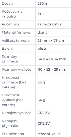 Oblíbený výcvikový obojek funguje na vzdálenost 250 m a je vhodný pro střední a větší plemena psů. Pomůcka pro výcvik základních povelů na krátkou vzdálenost, nebo pro každodenní vycházky. Funkce zvuk, stimulační impulsy 0 – 19, tlačítko booster pro nastavení vyššího impulsu.
