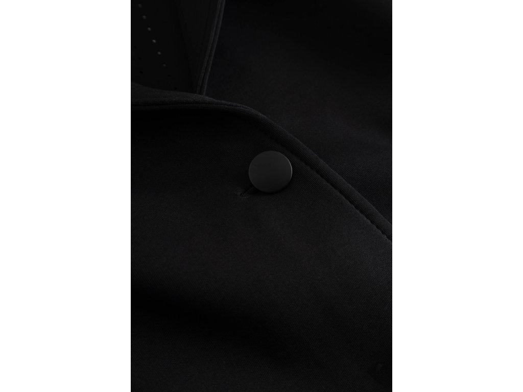 Zadní část saka je vybavena perforovaným panelem, který zlepšuje ventilaci a pomáhá udržovat optimální tělesnou teplotu během jízdy. Praktický dvoucestný zip na přední straně usnadňuje oblékání a zajišťuje flexibilitu při pohybu. Horní část zipu je překryta knoflíkovou lištou, která zachovává klasický elegantní vzhled závodního saka.